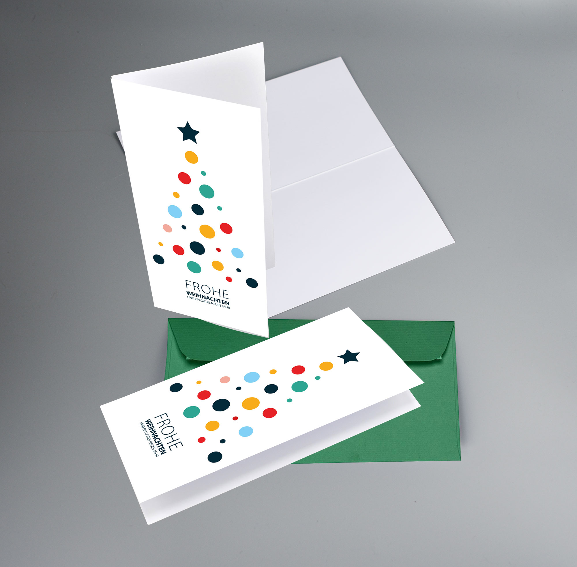 Minimalismus - Weihnachtsbaum aus Kugeln mit Schriftzug FROHE WEIHNACHTEN UND EIN GUTES NEUES JAHR- Setzen Sie Akzente mit einer außergewöhnlichen Weihnachtskarte als Klappkarte (210 x 105 mm), 300 g Designkarton, matt ungestrichen, mit Volumen, innen unbedruckt, inkl.farblich abgestimmtem Umschlag. Wir haben ein passendes, Kuvert in der weihnachtlichen Farbe in tannengrün ausgesucht. Auf Wunsch erhalten Sie gerne auch deine andere Farbe. Sprechen Sie uns dazu bitte an!