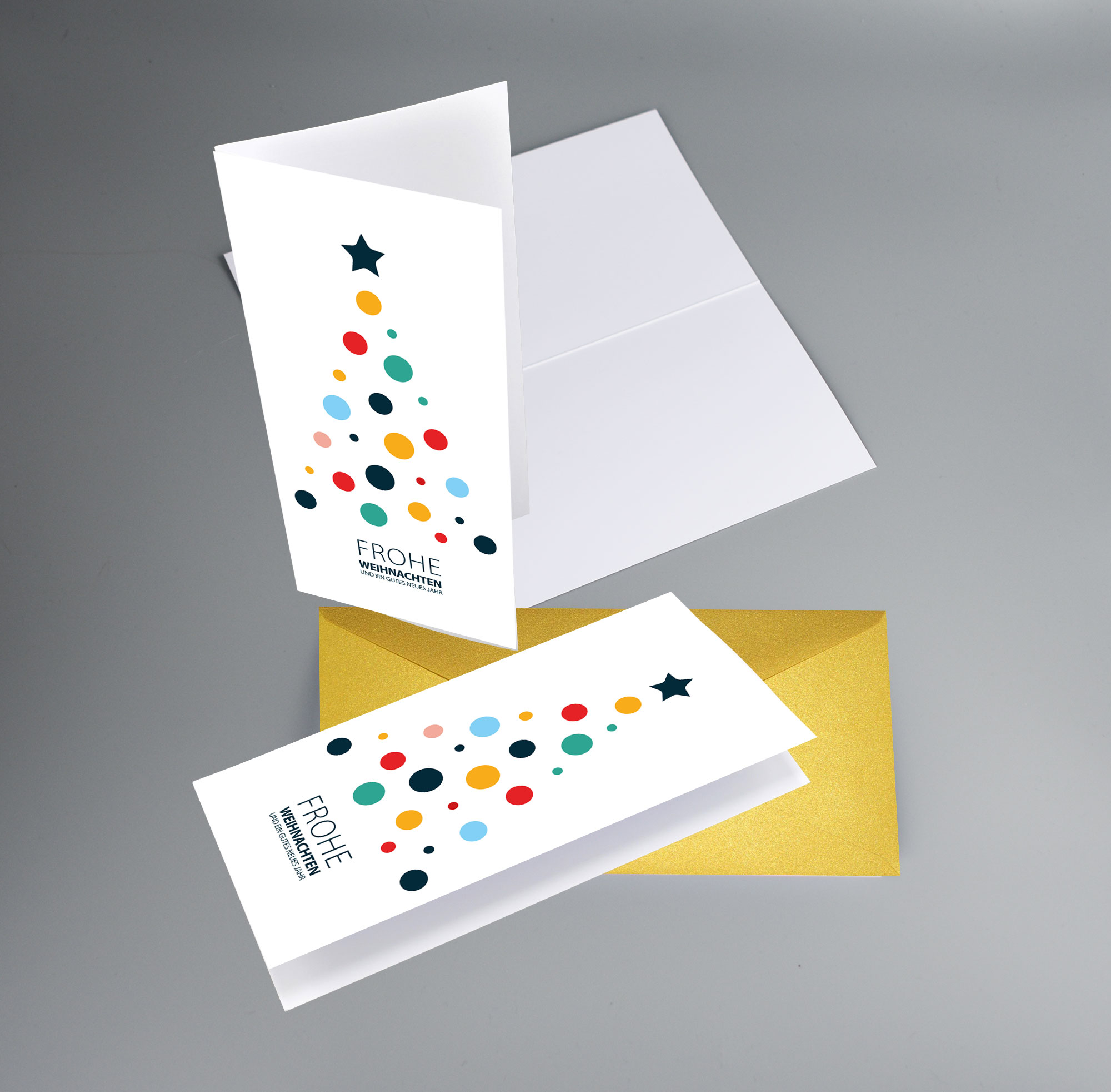 Minimalismus - Weihnachtsbaum aus Kugeln mit Schriftzug FROHE WEIHNACHTEN UND EIN GUTES NEUES JAHR- Setzen Sie Akzente mit einer außergewöhnlichen Weihnachtskarte als Klappkarte (210 x 105 mm), 300 g Designkarton, matt ungestrichen, mit Volumen, innen unbedruckt, inkl.farblich abgestimmtem Umschlag. Wir haben ein passendes, Kuvert in der Farbe gold ausgesucht. Auf Wunsch erhalten Sie gerne auch deine andere Farbe. Sprechen Sie uns dazu bitte an!